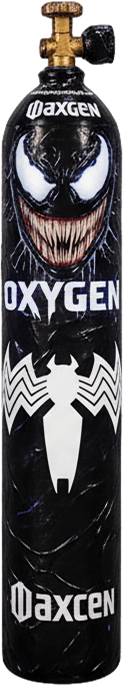 Корпус — сталь. Снаружи серая краска и синяя полоса: так маркируют ёмкости с закисью азота по ГОСТу. На горловине вентиль с левой резьбой W21,8×1/14″. Левая — чтобы случайно не накрутить что-нибудь несовместимое. Сверху защитный колпак: арматура не побьётся при перевозке.
